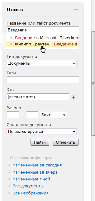 Кроме всего, возможно применение фильтров при поиске. Фильтры представляют из себя условия для поиска, которые помогают конкретизировать результаты, отсортировав документы в предоставляемых списках. В фильтр так же вы можете добавить такие параметры, как: теги, время, тип, автора, размер и состояние документов. В большинстве случаев используемые фильтры можно сохранить и потом выбирать их из перечня фильтров-заготовок.