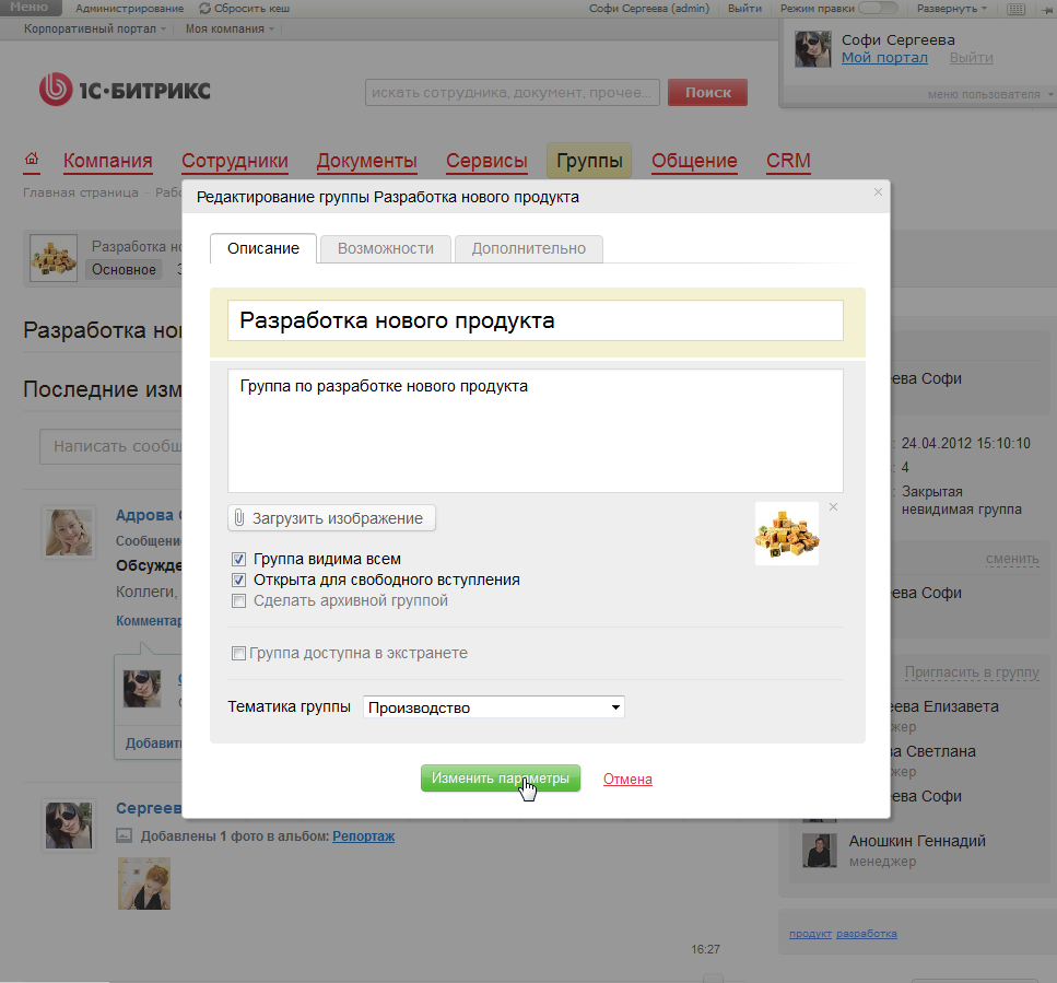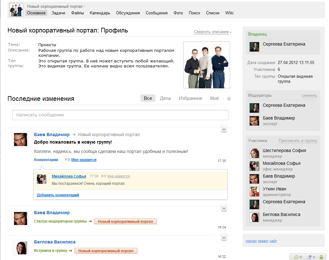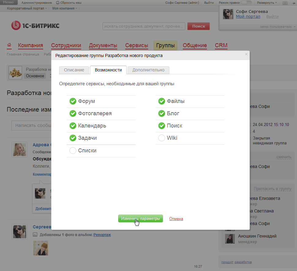 Битрикс24: обмен сообщениями внутри группы, фотографии группы