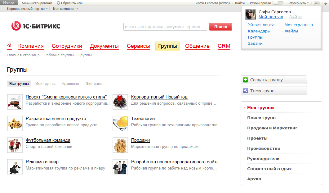 Список рабочих групп выглядит как достаточно компактно, так и обладает необходимой информативностью. Сотрудник имеет возможность наблюдать через одну страницу все группы, находящиеся на портале и имеет возможность отобрать из представленного перечня свои, а так же архивные и группы категории Экстранет. Так же имеется возможность осуществления поиска по группам.
