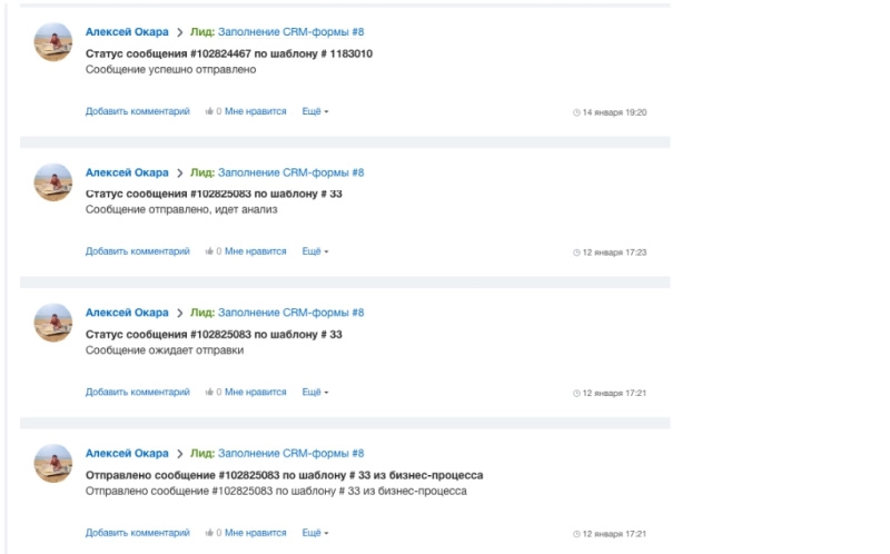 - В Ленте CRM вы видите уведомления об изменениях статуса отправки письма. Рассылка по шаблонам состоялась.