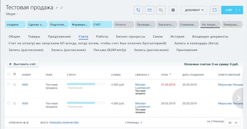 После того, как настроены стадии сделки и сам бизнес-процесс, можно проверить его в работе.
