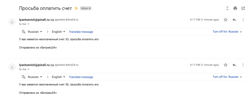 Если в сделке есть неоплаченные счета, то при попытке перевода ее на стадию «Проведена оплата», менеджер получит уведомление: