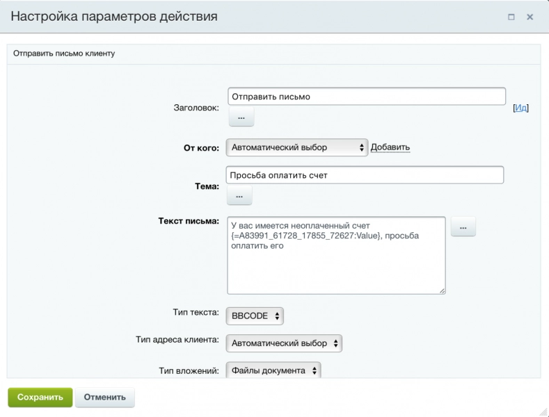 По регламенту компании сделка переходит на стадию «Счет», когда выставлен счет клиенту и на стадию «Проведена оплата», когда получено подтверждение оплаты счета. Необходимо автоматизировать контроль оплаты счетов по сделкам, чтобы сделки, по которым есть неоплаченные счета не могли перейти на стадию «Проведена оплата». Если будут найдены неоплаченные счета по сделке, то ее перевод на данную стадию блокируется и менеджер должен получить соответствующее уведомление. Дополнительно клиенту должно отправится письмо с просьбой оплатить счет.