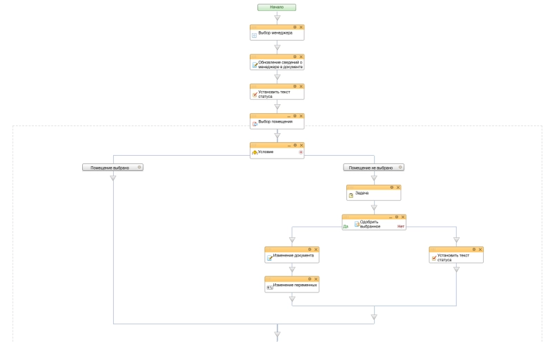 После завершения задачи инициатору бизнес-процесса приходит задание по одобрению выбора помещения. В случае неодобрения ставится задача по новому поиску помещения. Одобрение — процесс переходит на следующую стадию.