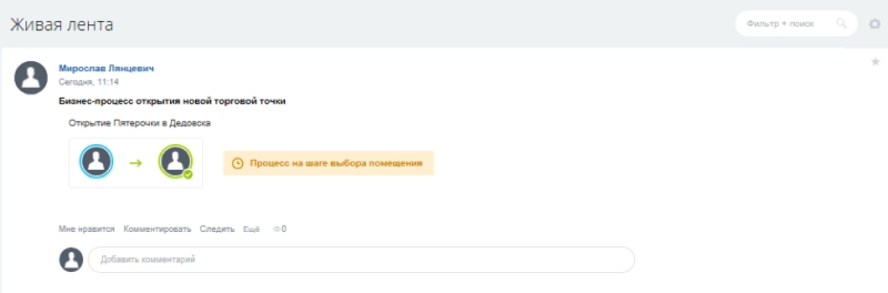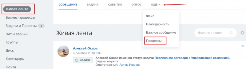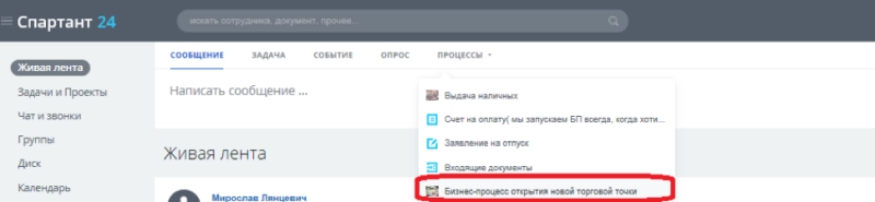 Запускает процесс открытия новой торговой точки ответственный менеджер непосредственно из Живой ленты Битрикс24 компании. Для этого в живой ленте выбирается пункт «Еще» — «Процессы»: