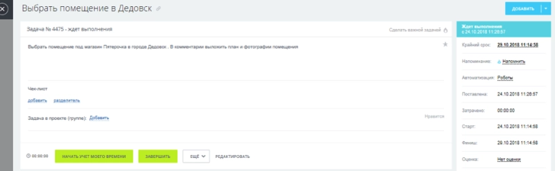 Ранее выбранному менеджеру создается задача по выбору помещения. На выполнение задачи дается 5 дней (система автоматически ставит крайний срок выполнения задачи +5 дней от даты постановки).