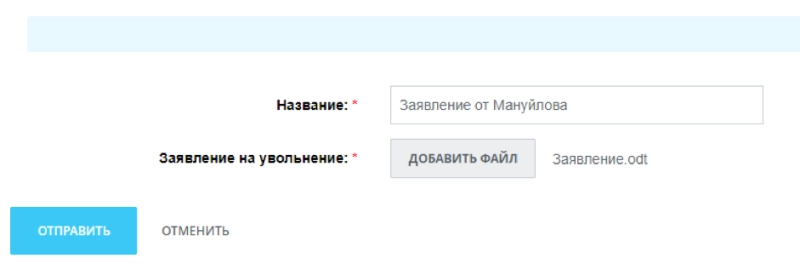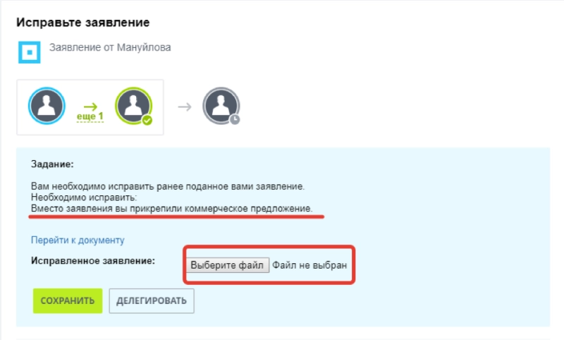 Сотрудник прикрепляет новое заявление и снова отправляет генеральному директору на согласование.