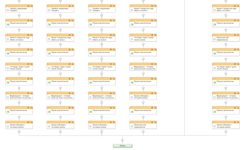 После отправки каждого письма следует пауза в 1 день. Процесс будет продолжаться до тех пор, пока не будет отправлено последнее письмо или менеджер, который ведет клиента примет решение об остановке бизнес-процесса.