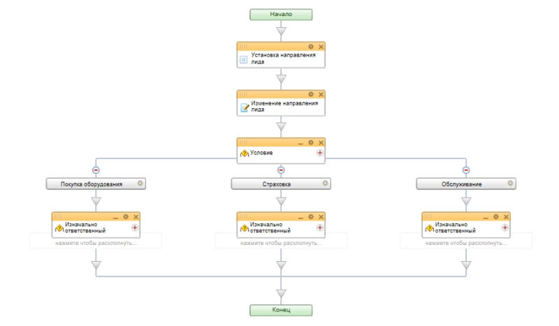 Далее, в зависимости от направления заявки, будет выполнена проверка — соответствует ли компетенция ответственного менеджера данной заявке. Если подразделение, в котором он работает, совпадает с направлением лида, то он и остается ответственным за лид. Иначе, ответственный за лид автоматически меняется на менеджера из другого подразделения, который соответствует данному направлению.