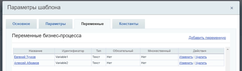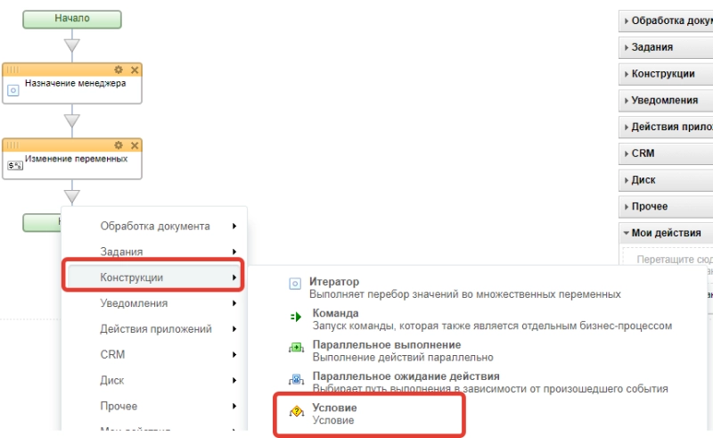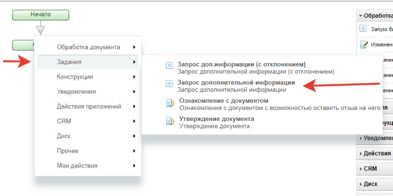 Для этого добавляем и настраиваем действия Запрос дополнительной информации и Изменение переменных: