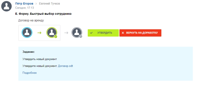 Далее юристу вновь даётся задание утвердить уже исправленный договор. Жмём на Утвердить, и бизнес-процесс считается завершенным.