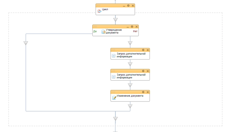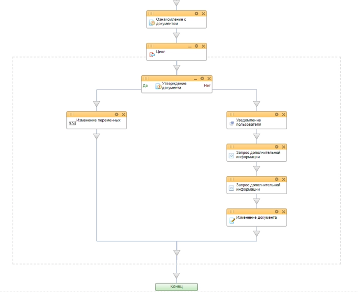 Кто-либо из компании, например, менеджер запускает данный бизнес-процесс. Далее всем сотрудникам юридического отдела даётся задание взять в работу. У каждого сотрудника юридического отдела появляется такая кнопка. Тот, кто первый на неё нажал, тот и будет ответственным юристом за данный документ. Далее юрист согласовывает данный документ. Если есть замечания, отклоняет и пишет правки. Менеджер исправляет, и заново отправляет на согласование юристу. И так до тех пор, пока юрист не утвердит документ.