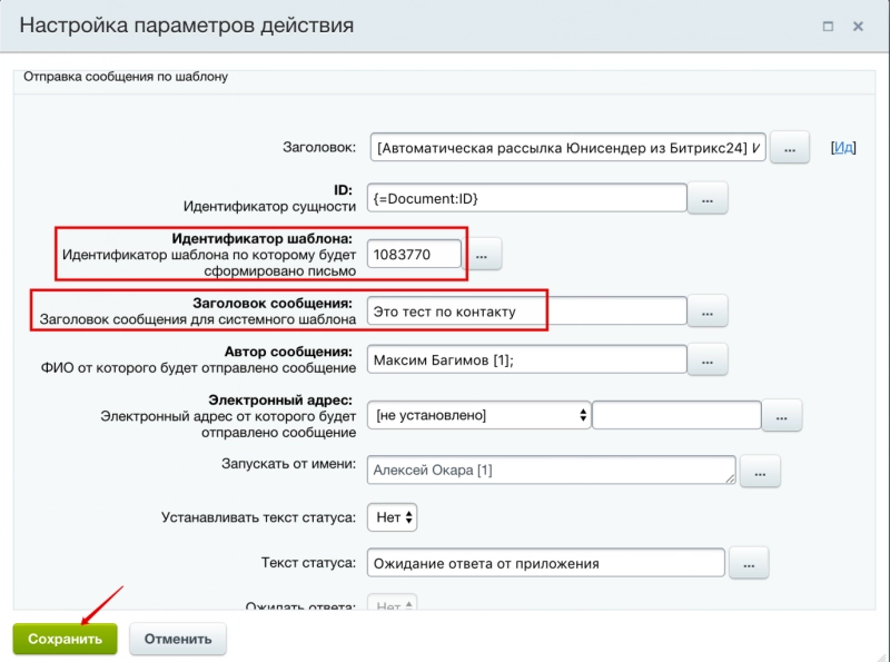 - Включенная опция автоматических рассылок писем через бизнес-процессы интеграции UniSender с Битрикс24 от Пинол.