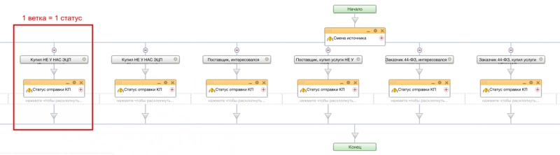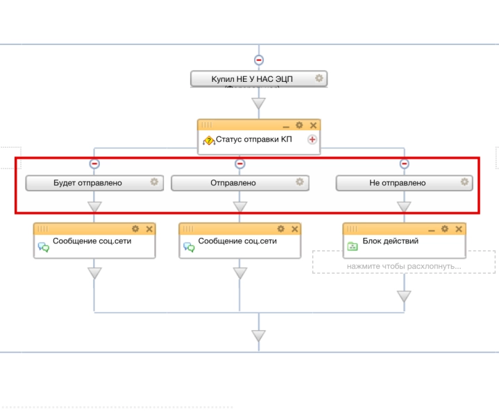 Спустя 23 часа будет отправлено первое письмо, а спустя 120 часов — второе. После отправки установленных сообщений (разных вариантов коммерческого предложения), бизнес-процесс присвоит статусу клиента значение «КП отправлено» и завершит работу.