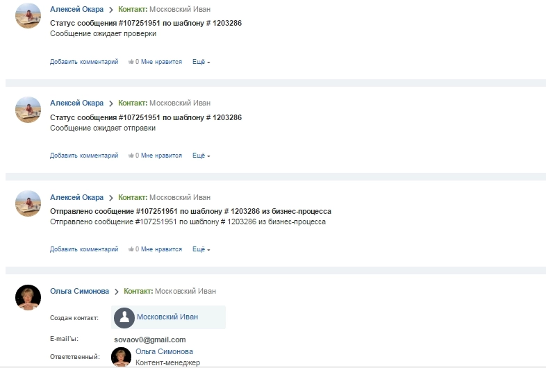 В Ленте CRM вы видите уведомления об изменениях статуса отправки письма (увидеть полную статистику по рассылке можно в личном кабинете UniSender). Рассылка по шаблонам состоялась: