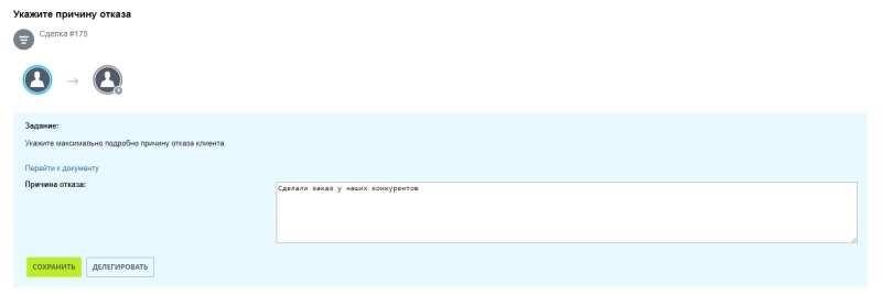 Бизнес-процесс даёт задание указать причину отказа.