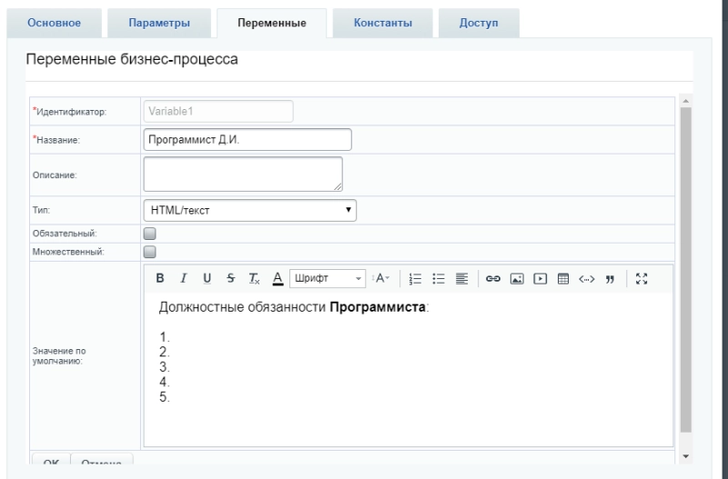 Далее бизнес-процесс даёт задание указать данные для программиста.
