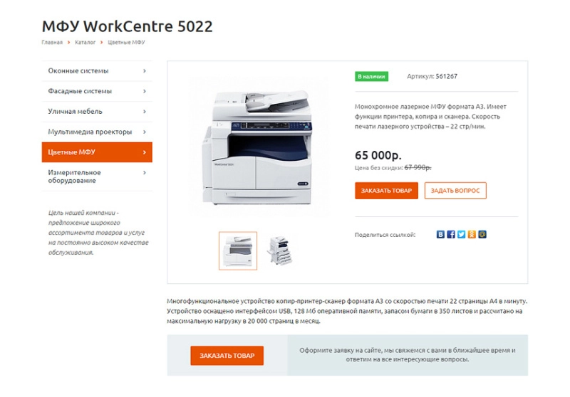 - Компактный блок заказа товара с ценой, индикатором наличия и формой обратной связи “Задать вопрос”;