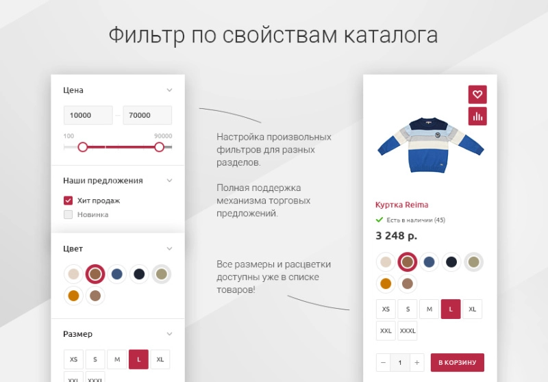 - Поддержка торговых предложений: цвет, размер, фасовка и т.п.;