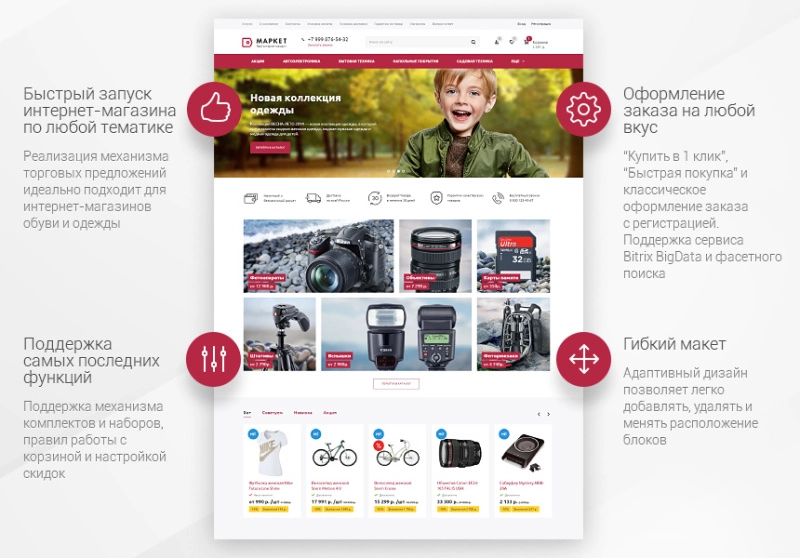 Аспро: Маркет - это универсальный интернет-магазин для продажи любых видов товаров. Решение прекрасно адаптировано для продажи одежды, электроники, бытовой техники, стройматериалов, детских товаров, оборудования, продуктов питания и прочих товаров.