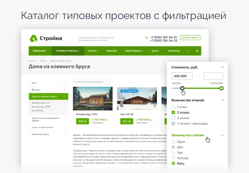 - каталог типовых проектов с настроенным фильтром уже содержит основные разделы (каркасные дома, дома из клеевого бруса, дома из пеноблоков, бани, беседки), которые легко изменить при необходимости