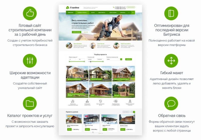 Структура сайта создана с учетом специфических потребностей строительного бизнеса. Это нравится., потому что хочется, чтобы шаблон учитывал сферу деятельности компании.