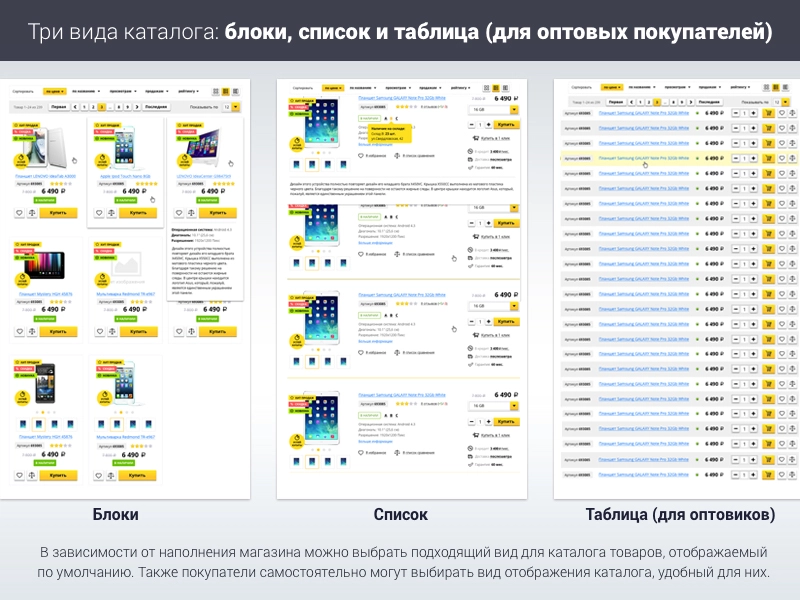 - 3 вида отображения списка товаров: плитка — краткий, список — подробный, таблица — для оптовых покупателей