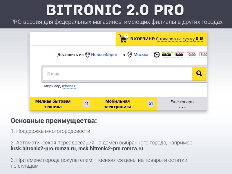 PRO-версия — для федеральных магазинов: цена, наличие на складах, контактные данные и доменное имя зависят от выбранного города!