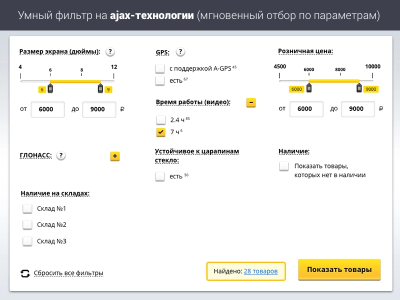- "Умный фильтр" с фасетным индексом в двух видах: вертикальный или горизонтальный вид — на выбор!