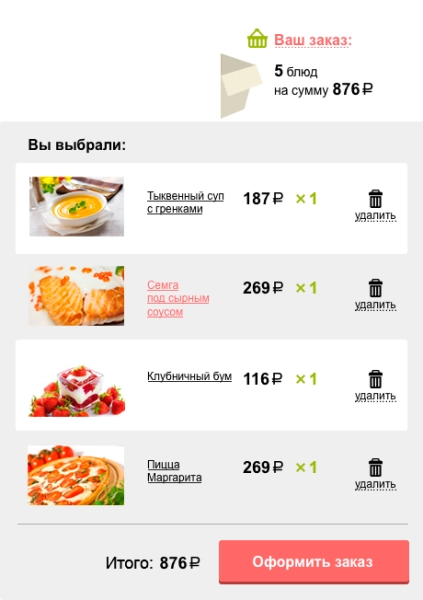 Покажите вашим клиентам, сколько заказов вы уже обработали за день, а также хиты и предложение дня. Аппетитные картинки в этом блоке простимулируют клиента дополнить заказ еще несколькими позициями.