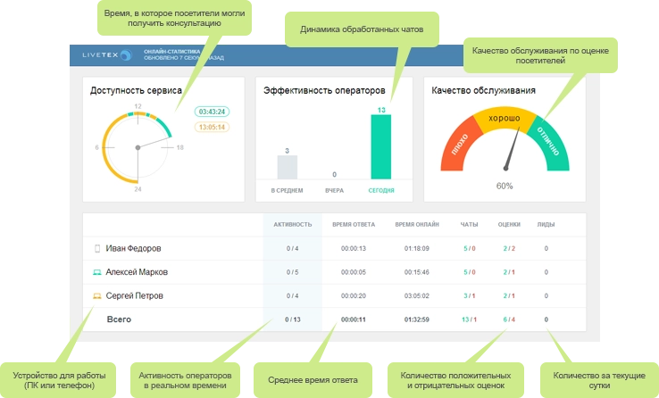 - Онлайн-статистика LiveTex доступна как с компьютера, так и в мобильных браузерах. Контролировать операторов можно в любом месте и в любое время.