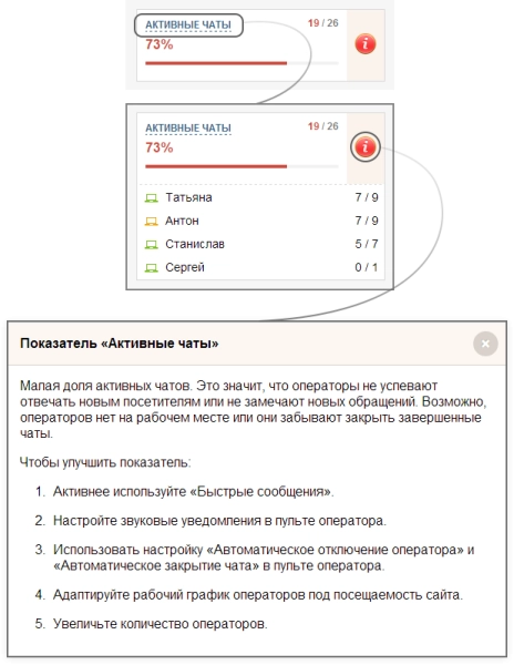 - Виджет показывает время, в которое посетители могли получить консультацию, а также позволяет узнать, когда операторы были недоступны. На графике отображаются все паузы в обслуживании. Можно быстро узнать, активны ли операторы прямо сейчас, и как быстро они отвечают посетителям.