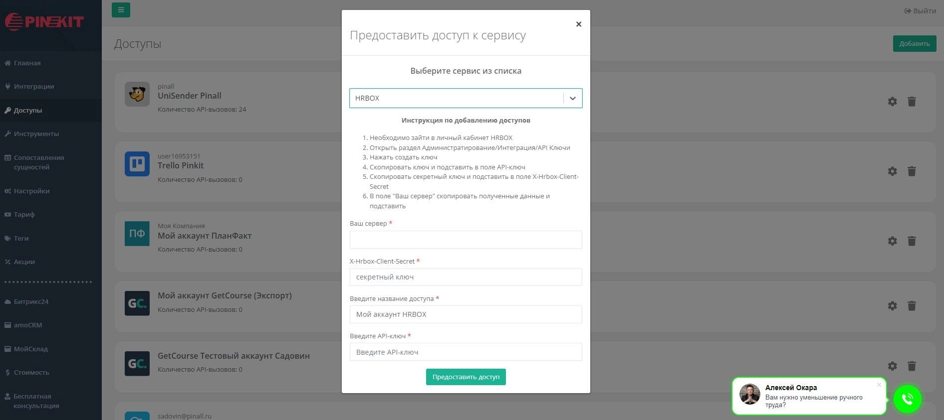 Теперь на вкладке доступов можно выбрать сервис HRBOX и добавить его авторизацию.