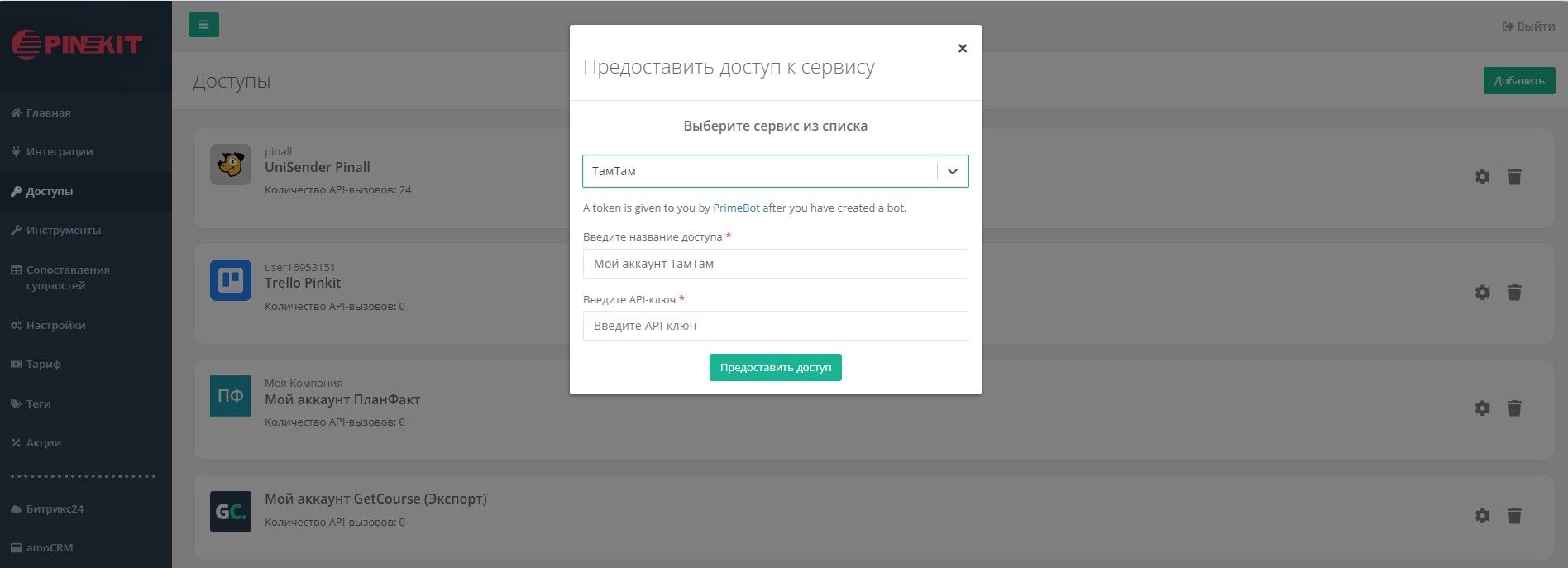 Для этого необходимо перейти в "Доступы" => кнопка "Добавить" => выбрать из списка сервис "ТамТам" и заполнить название с API-ключом.