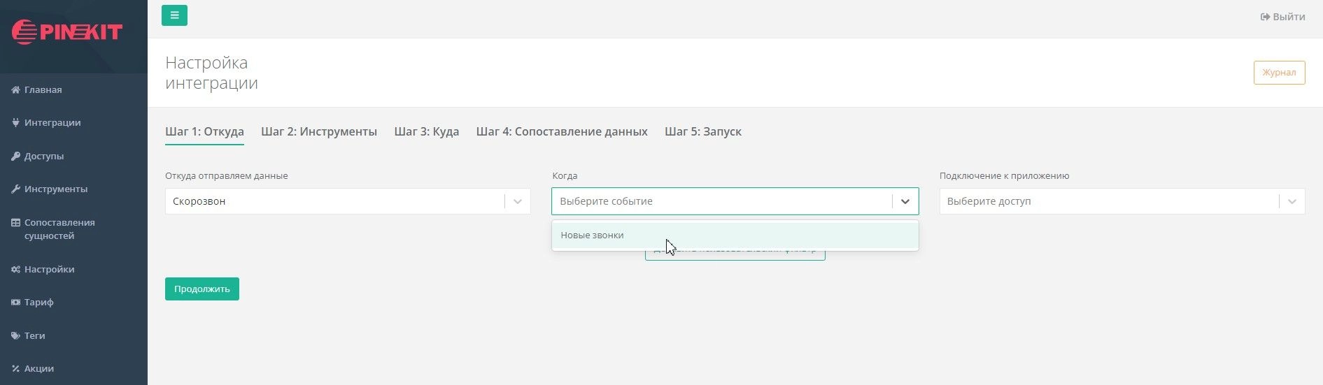 В настройке интеграции c сервисом Скорозвон на Шаг 1 добавлено событие "Новые звонки".
