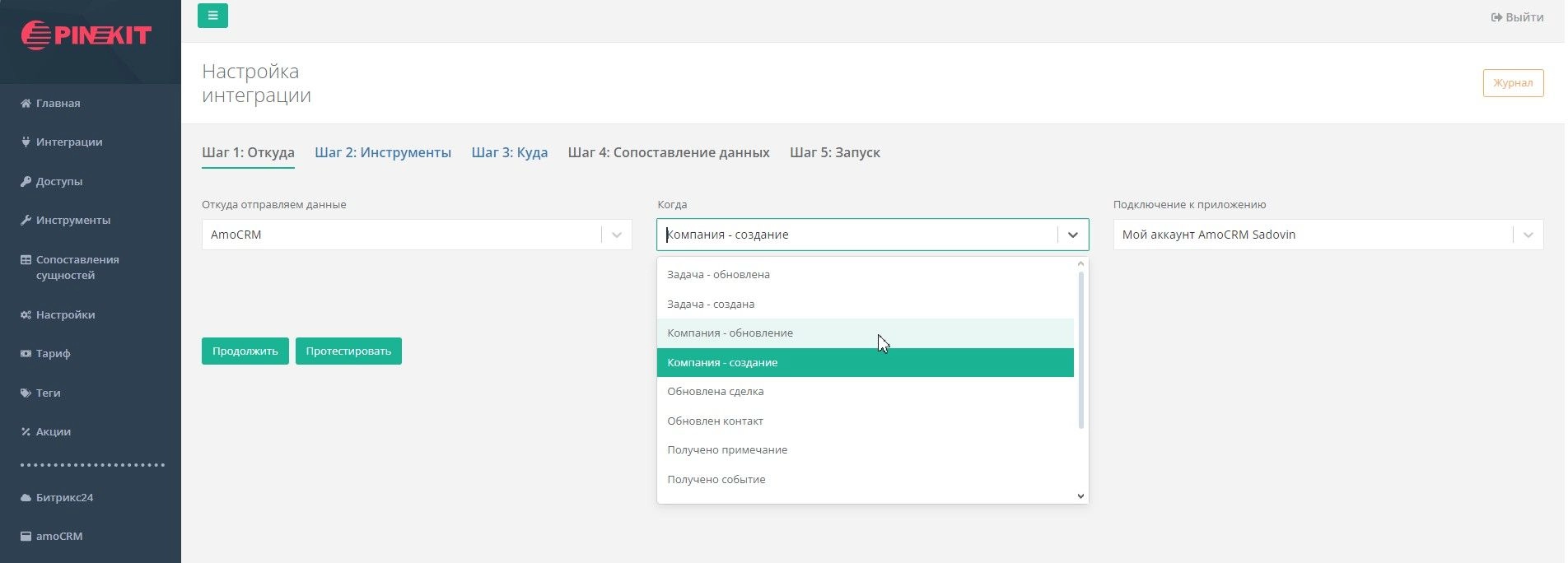 В настройке интеграции c amoCRM на Шаг 1 добавлены события: