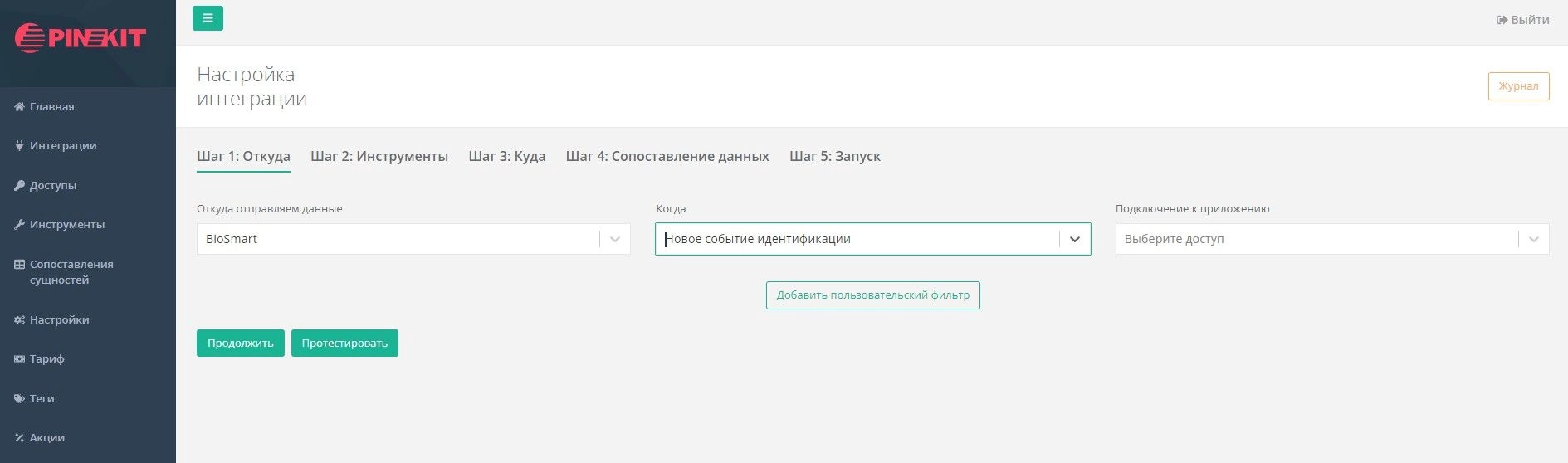 В настройке интеграции c сервисом BioSmart на Шаг 1 добавлено событие "Новое событие идентификации".
