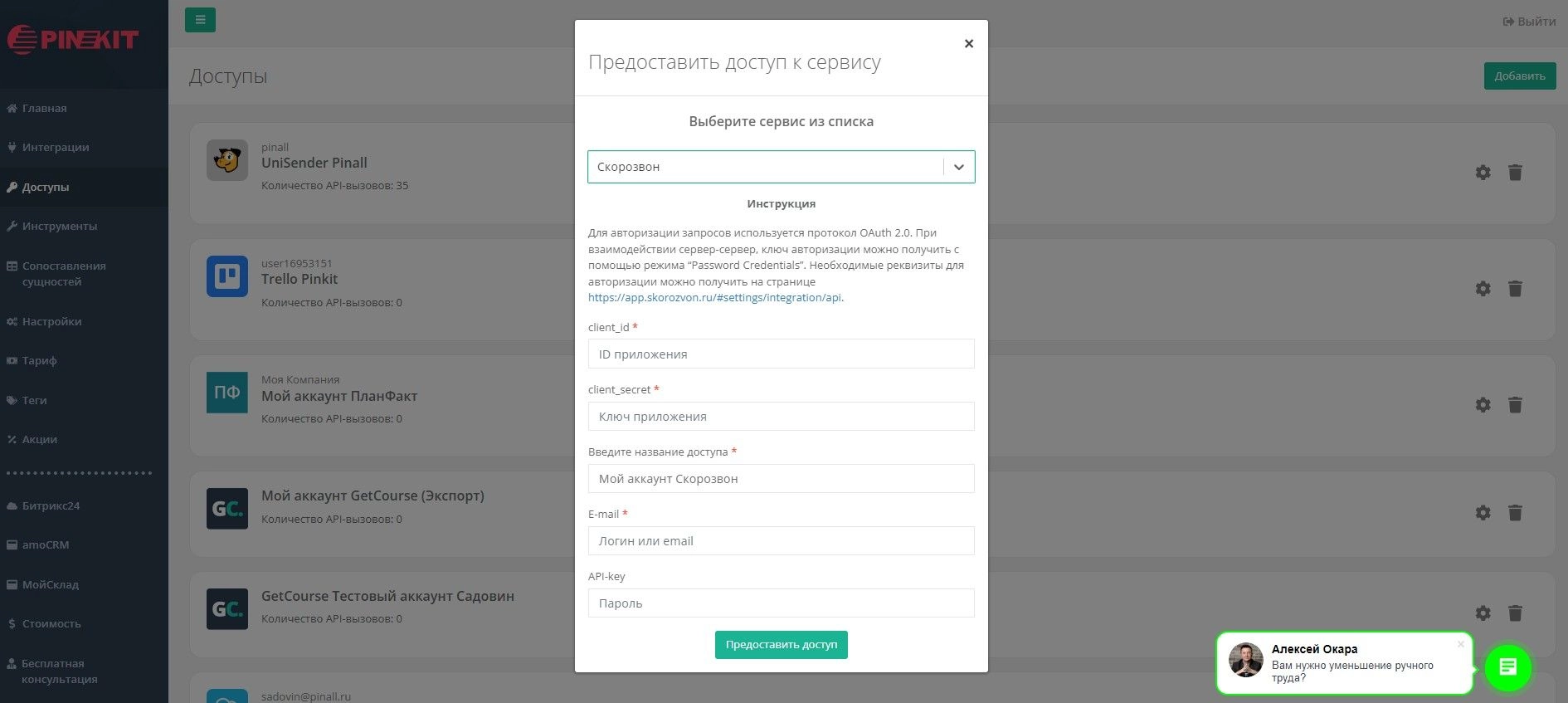 Добавили авторизацию с сервисом Скорозвон в личном кабинете Пинкит.