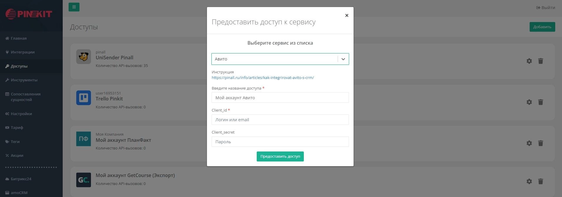 В разделе Доступы изменён интерфейс авторизации для сервиса Авито: