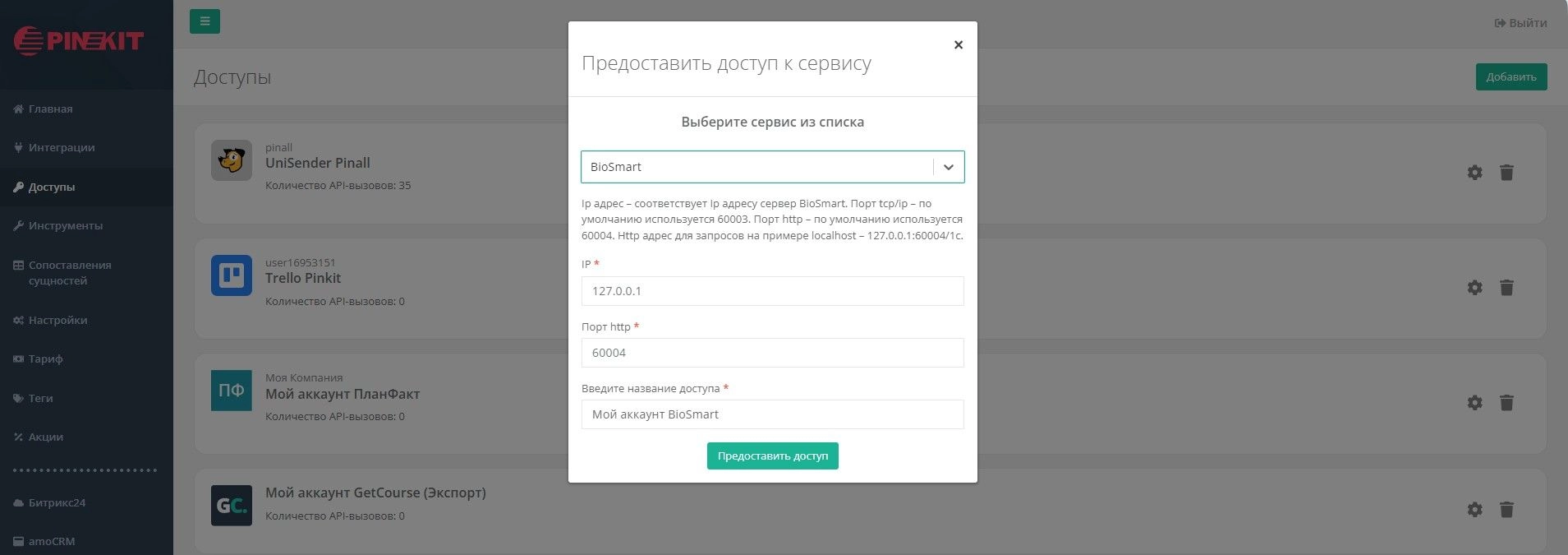 Теперь на вкладке доступов можно выбрать сервис BioSmart и добавить его авторизацию.