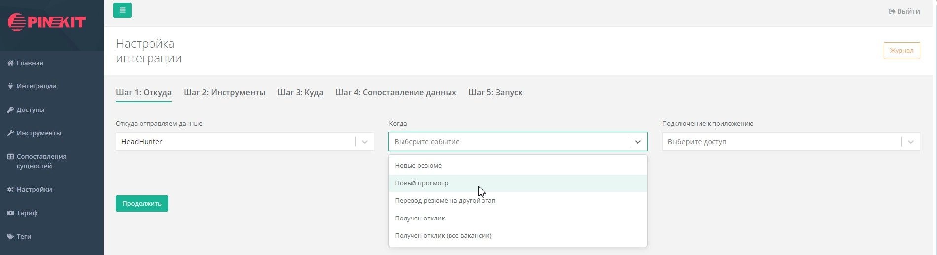 В настройке интеграции c HeadHunter на Шаг 1 добавлено событие "Новый просмотр".