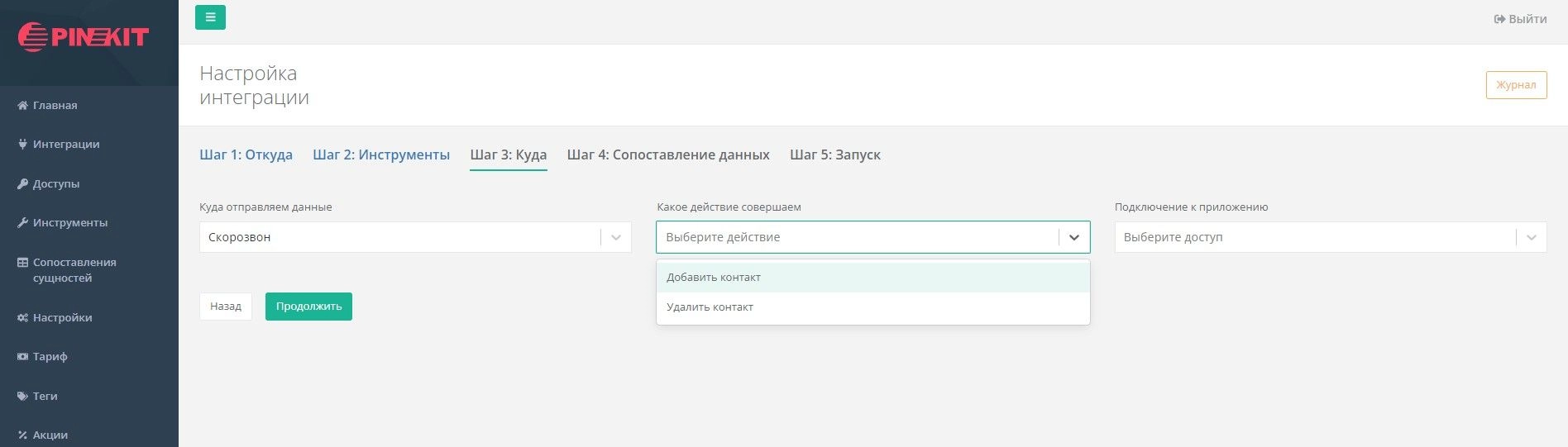 В настройке интеграции c сервисом Скорозвон на Шаг 3 добавлены действия: "Добавить контакт" и "Удалить контакт".