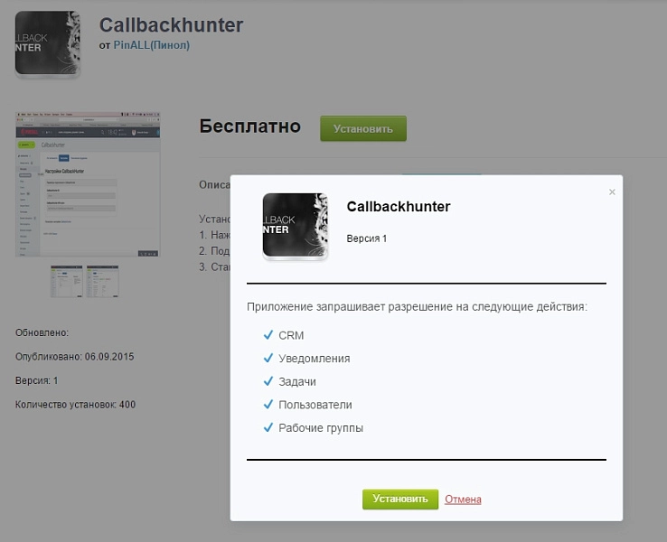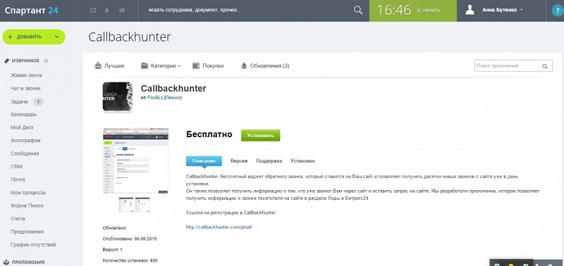 3. Установите бесплатное приложение по интеграции Битрикс24 и Callbackhunter.