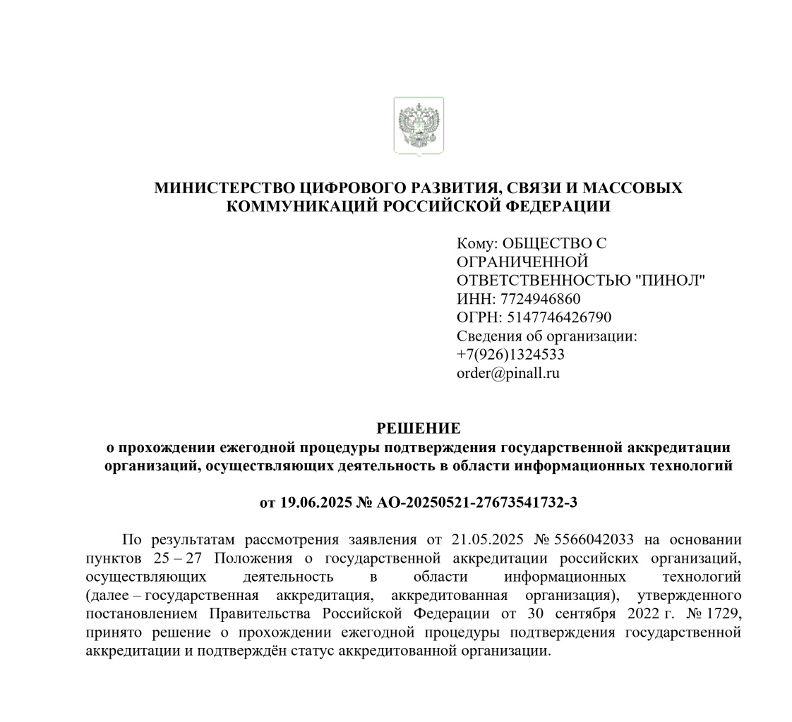 Компания ООО «Пинол» успешно прошла ежегодную процедуру подтверждения государственной аккредитации в качестве организации, работающей в сфере информационных технологий.