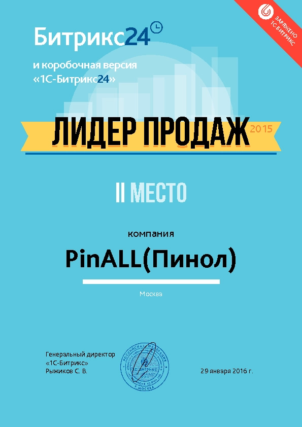 Компания Пинол заняла второе место в рейтинге ЛИДЕР ПРОДАЖ «1С-Битрикс24» по результатам 2015 года.