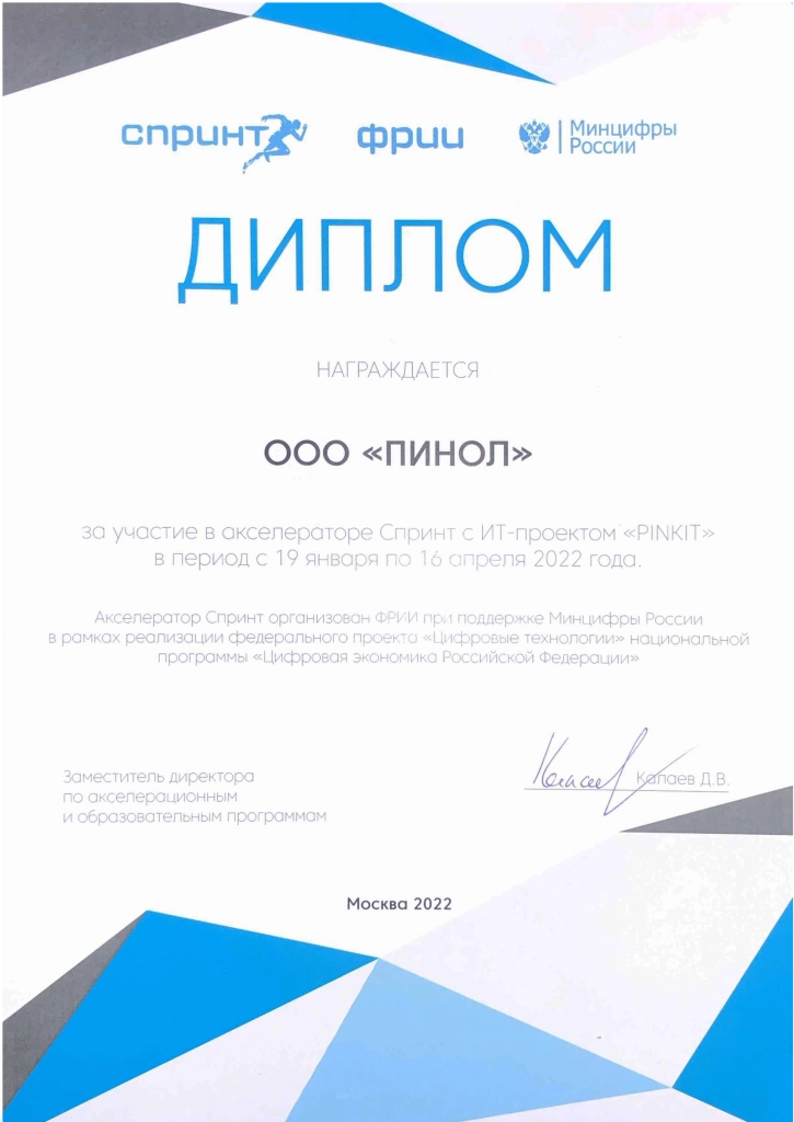 По итогам события компания Пинол была отмечена дипломом за участие в акселераторе Спринт.