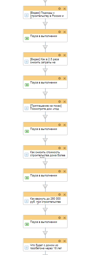 - в рабочий день процесс последовательно отрабатывает условия и в определенное время запускает отправку цепочки писем по шаблонам из Unisender;