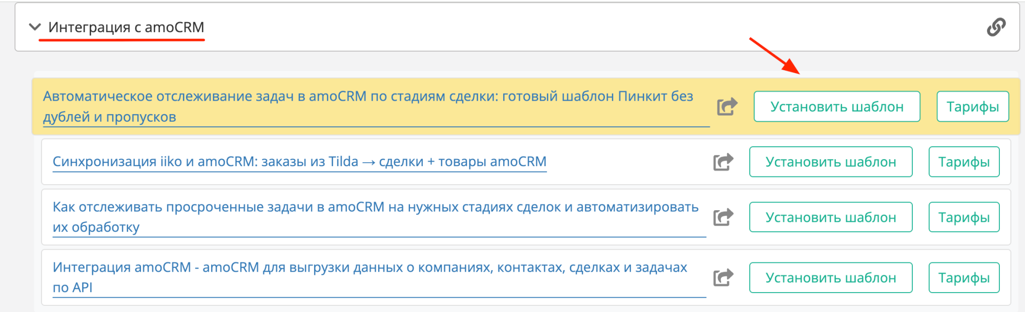 Используйте готовый шаблон интеграции для amoCRM на платформе Пинкит.