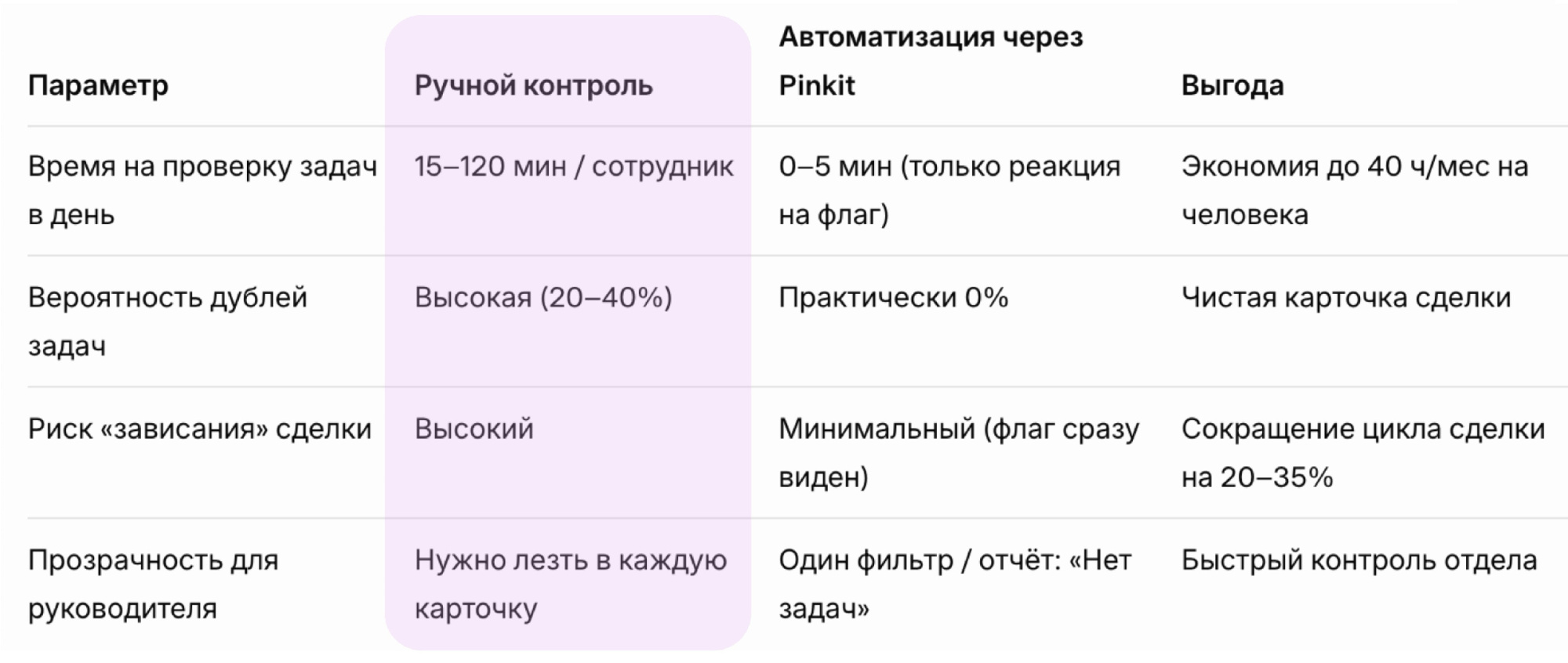 Автоматический контроль: Теперь менеджеры не нужно вручную проверять каждую сделку на наличие задач. Все это делает система.