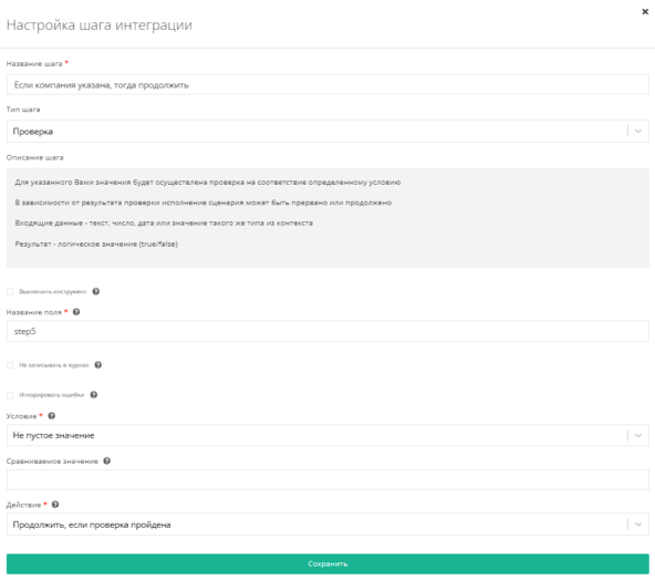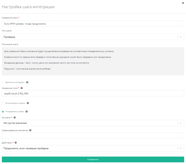Используем проверку по полю step8.result.0.RQ_INN. Условие - Не пустое значение, Действие - Продолжить, если проверка пройдена.